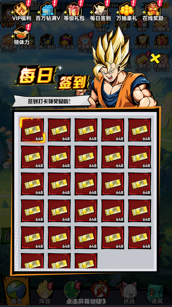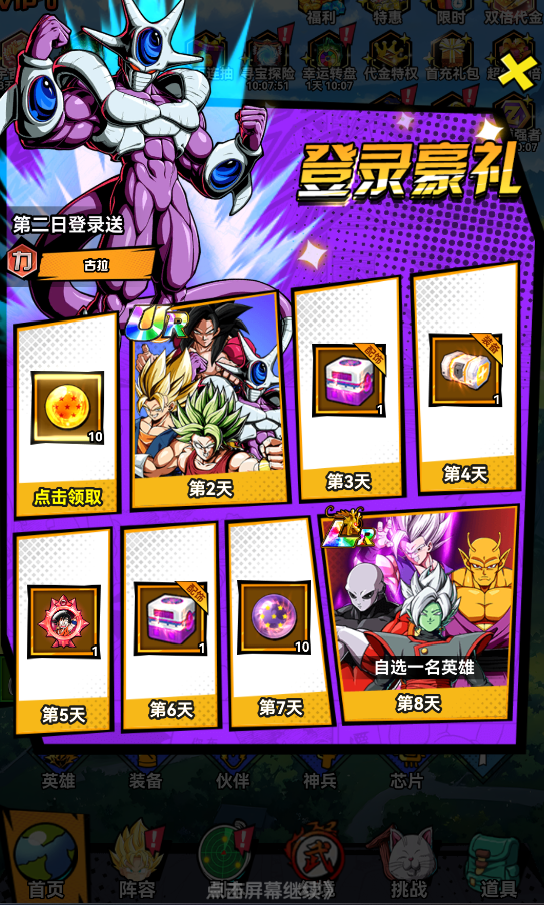 3、?八日簽到活動(dòng):主力橙色英雄自選、頂級(jí)配飾、頂級(jí)橙裝一套、小悟空紅色紋章,第8天更有頂級(jí)LR英雄自選!豪禮天天送!