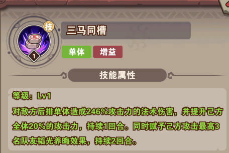 滿怒技【三馬同槽】對敵方后排造成高額傷害并提升我方全體20%的攻擊效果;同時為我方3名攻擊最高的友軍施加增益buff【韜光養(yǎng)晦】
