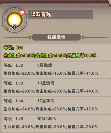 被動一【謀取曹魏】 提升生命、攻擊、抗暴擊率效果