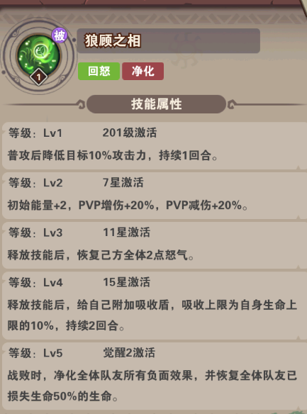 被動二【狼顧之相】 伴隨著技能等級提升解鎖相應的效果,降低敵方攻擊力,提升初始回能,釋放技能恢復全體2點怒氣,并為自己套上吸收盾,且戰(zhàn)敗時凈化全體友軍負面效果并恢復生命值