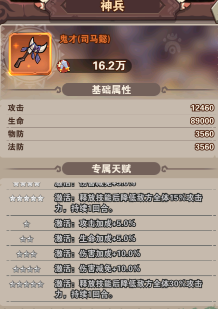 專屬神兵【鬼才】神兵效果:釋放技能后降低敵方全體攻擊力效果持續(xù)一回合