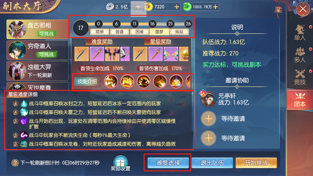 通過(guò)‘難度選擇’調(diào)整副本難度,‘難度獎(jiǎng)勵(lì)’‘星級(jí)獎(jiǎng)勵(lì)’會(huì)同時(shí)更改,難度越高獎(jiǎng)勵(lì)越好