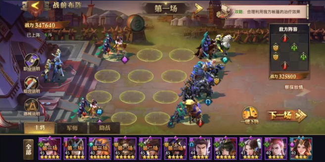 第三關(guān)敵方陣容比較單一己方也不要選什么花里胡哨的,分配戰(zhàn)力、上陣傳統(tǒng)陣容即可,要注意的是面對(duì)敵方多輕騎陣容時(shí),要保護(hù)好己方輸出主將,保證雙C安全,陣容才能夠穩(wěn)定。