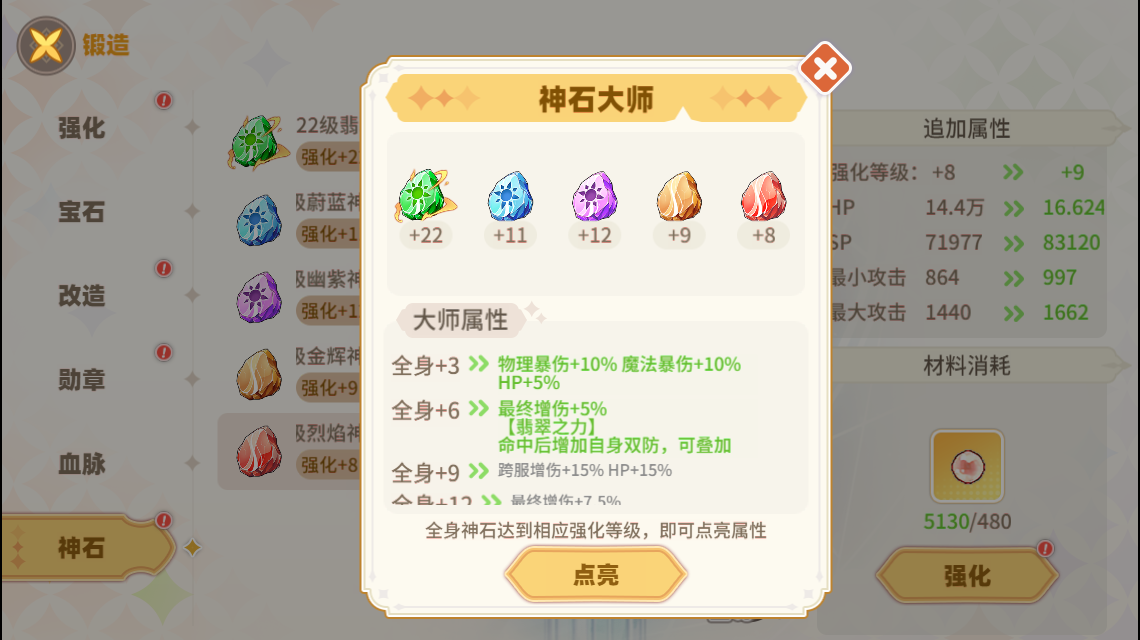 神石有5種類型,玩家可在神石寂寞查看神石屬性,消耗對應(yīng)材料可對神石進(jìn)行升級。