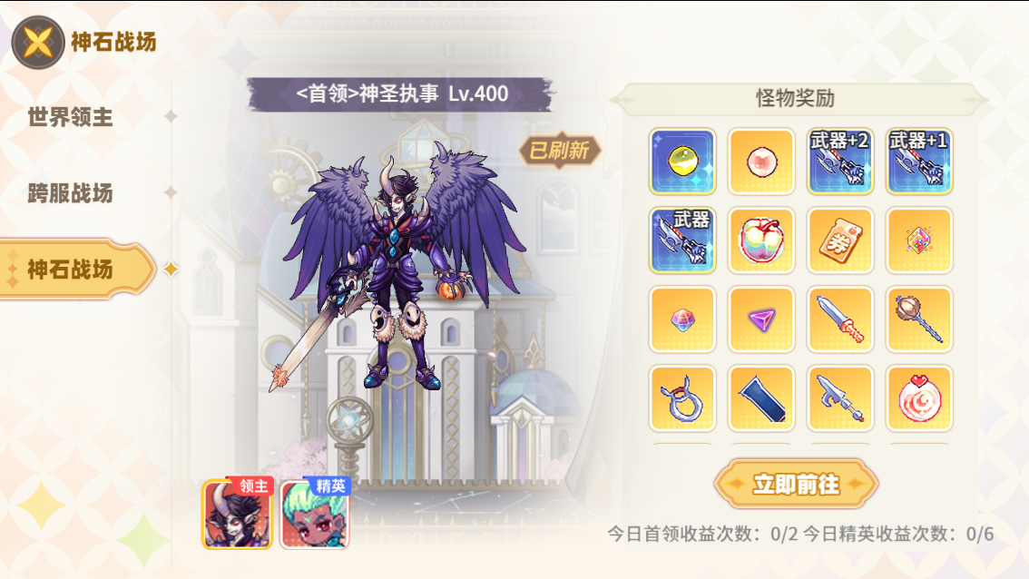 挑戰(zhàn)神石戰(zhàn)場的首領(lǐng)和精英可獲得對應(yīng)獎勵,首領(lǐng):傷害排名最高的個人或隊伍可獲得神石首領(lǐng)獎勵;精英:最后擊殺者可獲得精英獎勵。玩家每日可挑戰(zhàn)神圣戰(zhàn)場次數(shù)有限,超過次數(shù)將無法造成傷害無法獲得獎勵。