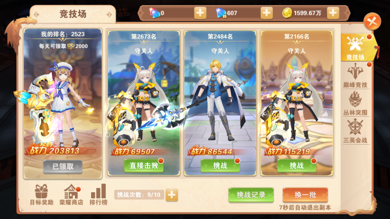 ??競(jìng)技場(chǎng)是進(jìn)行個(gè)人pvp的主要場(chǎng)所,玩家可查看對(duì)方戰(zhàn)力選擇想要挑戰(zhàn)的玩家,點(diǎn)擊挑戰(zhàn)后,將會(huì)被傳送至單獨(dú)的副本內(nèi)進(jìn)行1v1角斗,在其中獲勝/失敗都可以獲取榮耀勛章和經(jīng)驗(yàn)獎(jiǎng)勵(lì)。