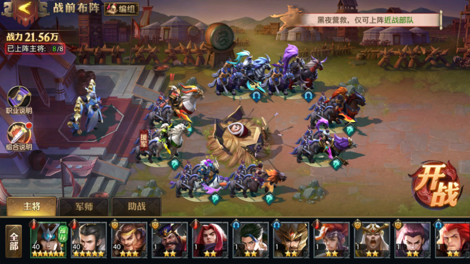 塔防模式,只能使用遠(yuǎn)程攻擊武將,謀士和弓手,高臺(tái)不會(huì)收到傷害,這邊建議玩家全都使用高輸出武將
